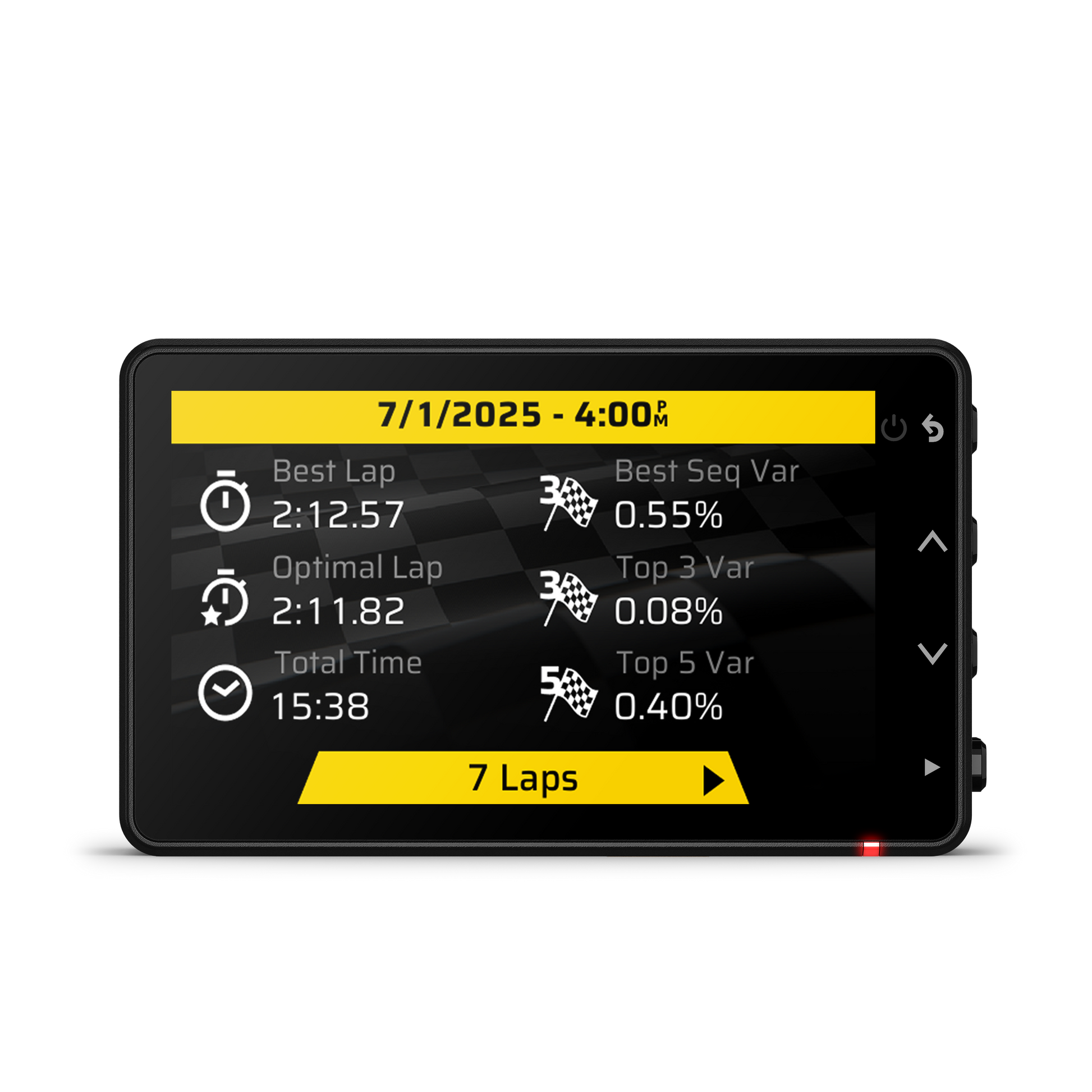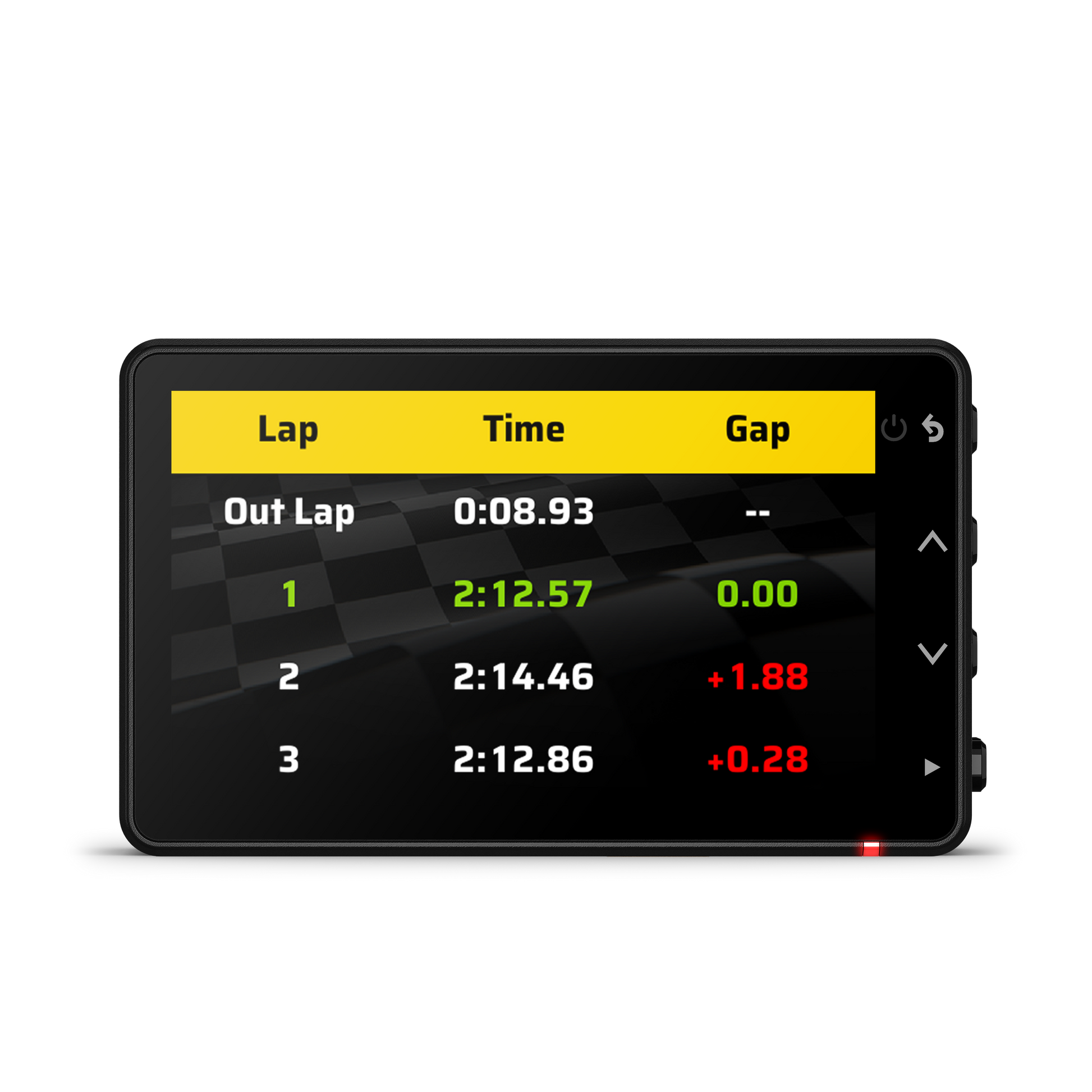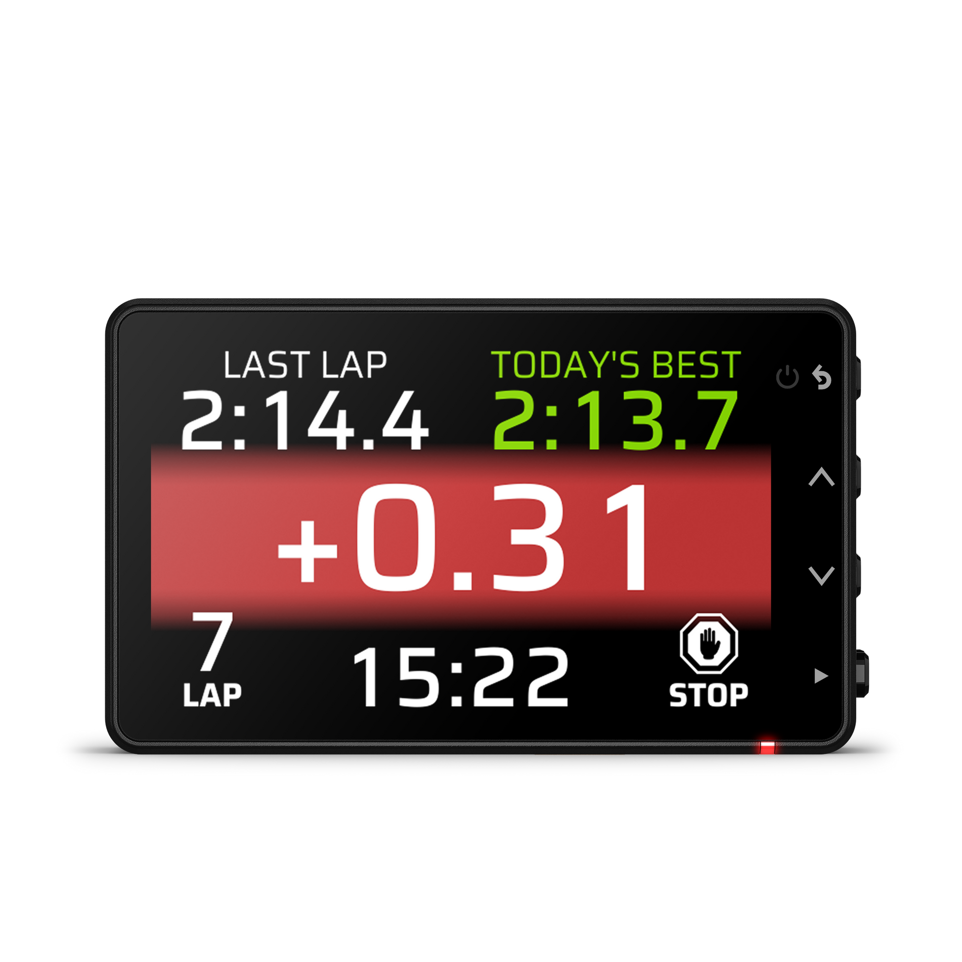 • On-device lap data including last lap time, best lap time, and adaptive delta time (with red/green gradient) plus total session time and laps completed.