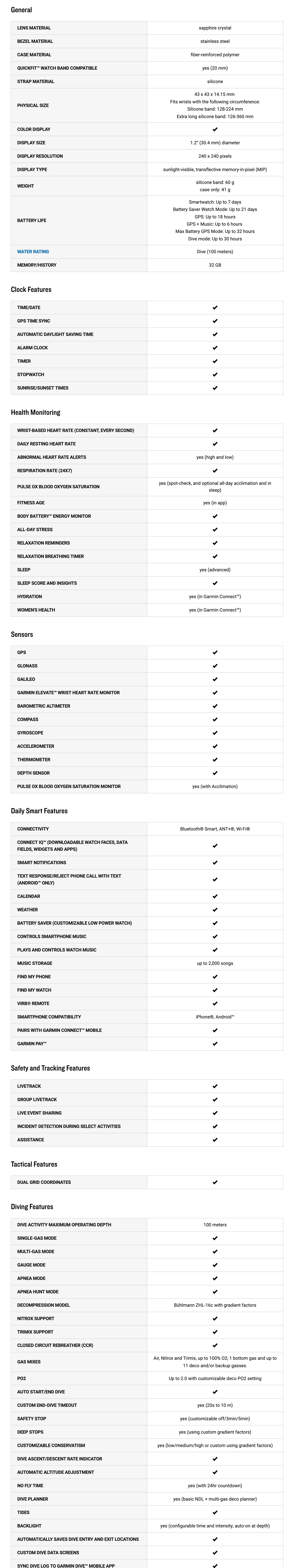 - Suivi des performances : enregistrez et examinez les données de 200 plongées maximum à l'aide de l'application Garmin Dive, faisant de chaque plongée une opportunité d'apprentissage.