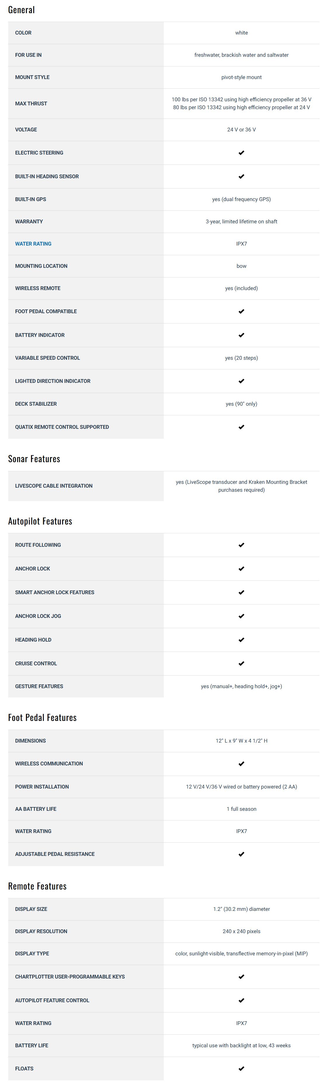 In summary, the Garmin Force Kraken Trolling Motor White 63" Trolling Motor is a must-have for serious anglers. With its unparalleled power, intelligent technology, and robust design, it redefines what you can expect from a trolling motor. Upgrade your fishing experience today and embrace the freedom of superior navigation and control!