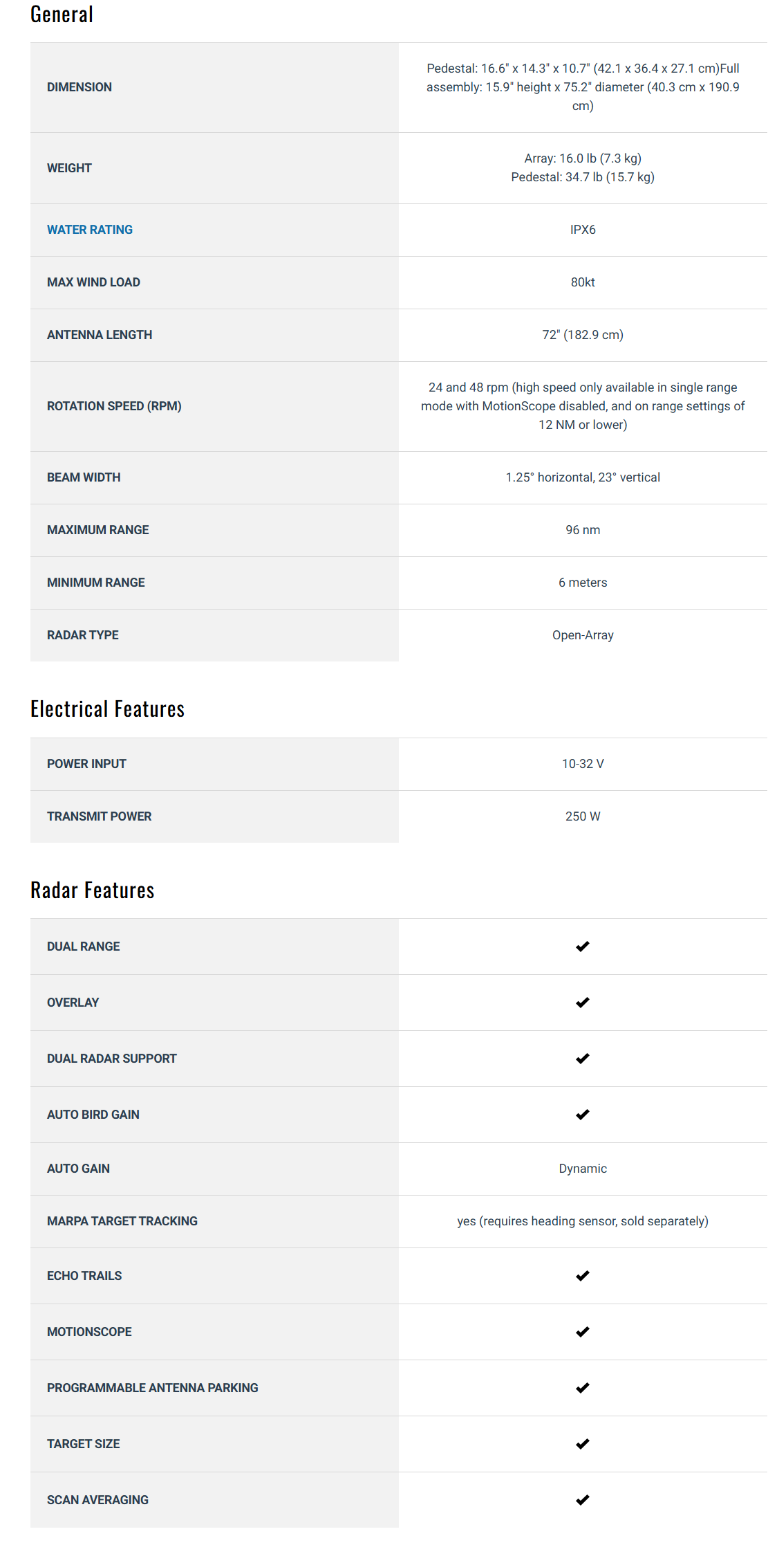 - 250-Watt Power Output: Detection range from 20' to 96 nautical miles.
