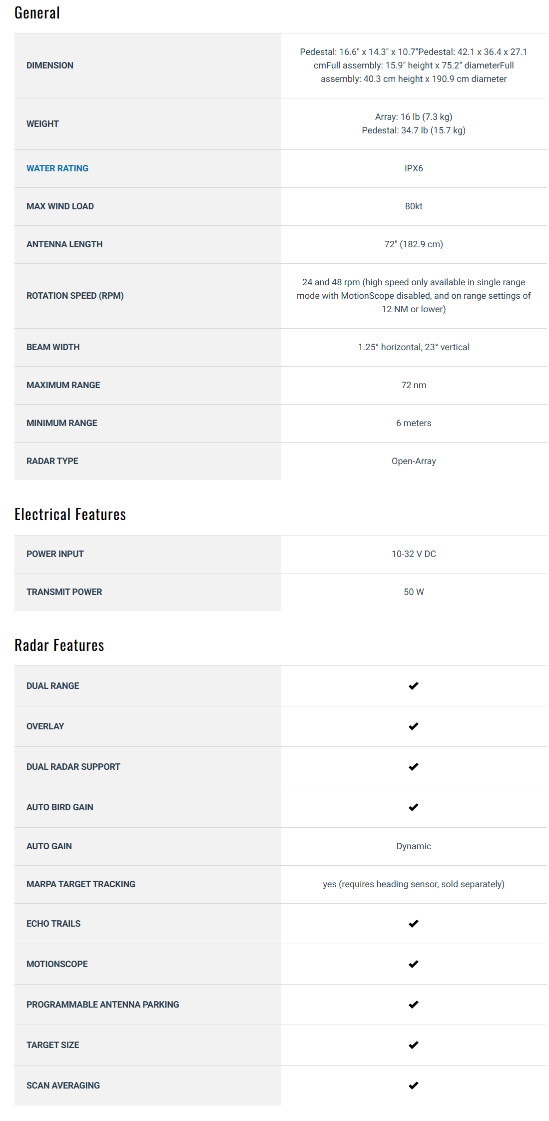 - 50-Watt Power Output: Detection range of 20’ to 72 nautical miles for comprehensive coverage.