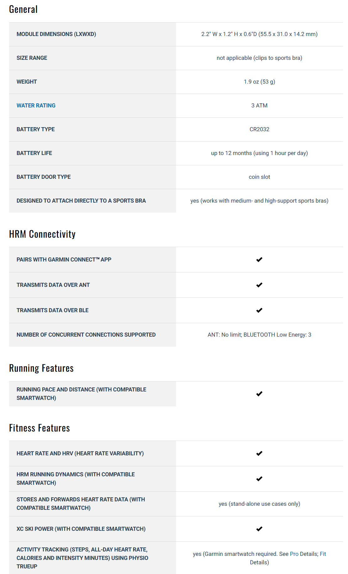 - Suivi du rythme et de la distance pendant les séances sur tapis roulant et sur piste en salle lorsqu'il est associé à une montre intelligente Garmin compatible.