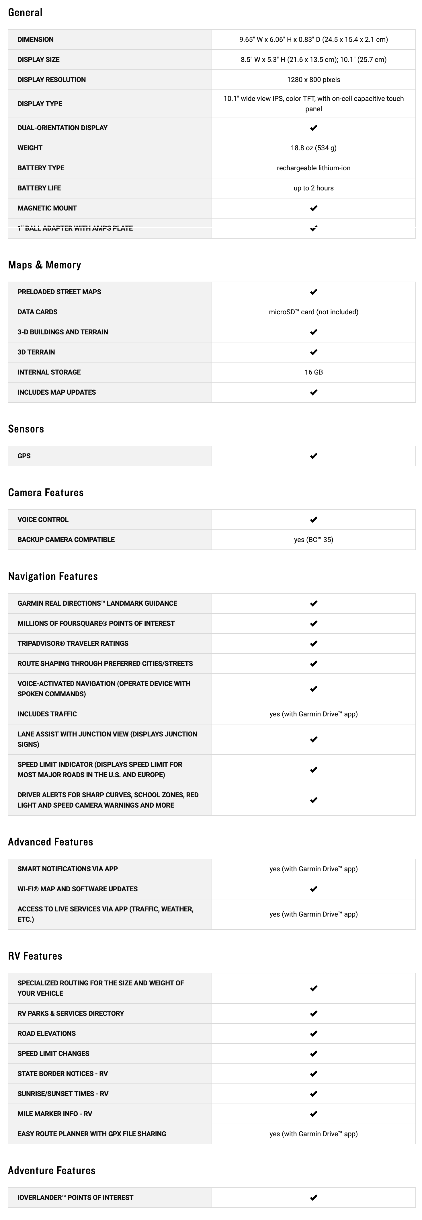- Compatibilité des accessoires : associez-le aux caméras de recul et au Garmin PowerSwitch pour contrôler l'électronique de votre véhicule directement depuis l'écran.