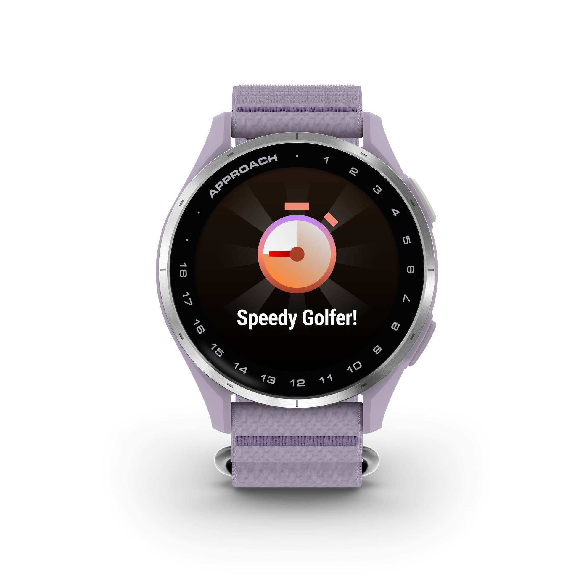 Designed to pair a sleek look with rugged on-course performance, the Approach J1 blends a silver aluminum bezel with a soft, lilac ComfortFit fabric band for a comfortable, kid-friendly feel. The design emphasizes a distraction-free experience, keeping essential data front and center while you swing.