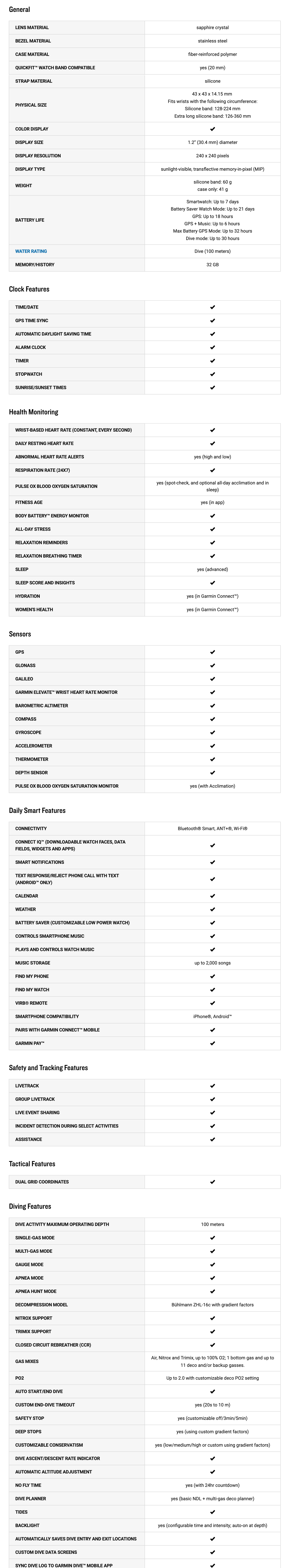 - Dive Log: Store and review data for up to 200 dives, easily share experiences through the Garmin Dive app.