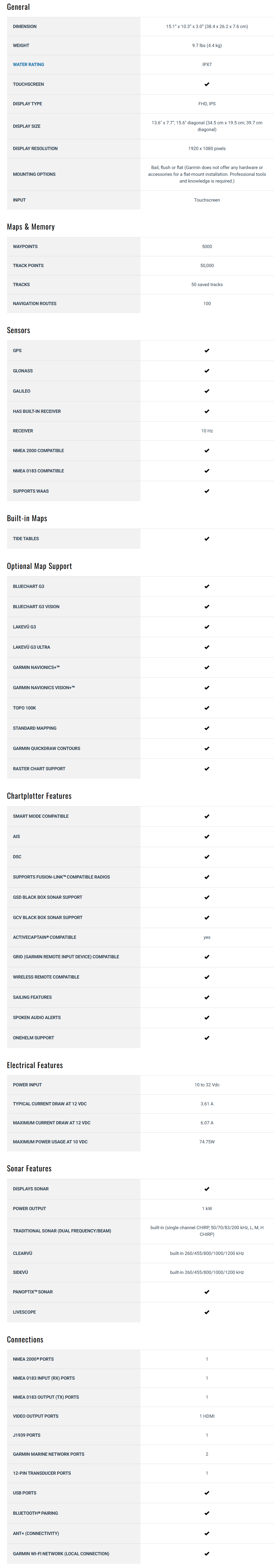 • Garmin Navionics+™ Maps: Preloaded mapping with daily updates for coastal and inland navigation.