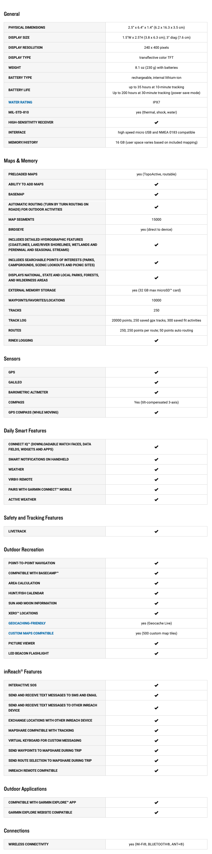 - InReach SOS and Two-Way Messaging: Send an interactive SOS to GEOS 24/7 emergency response and communicate via the global Iridium satellite network (subscription required).