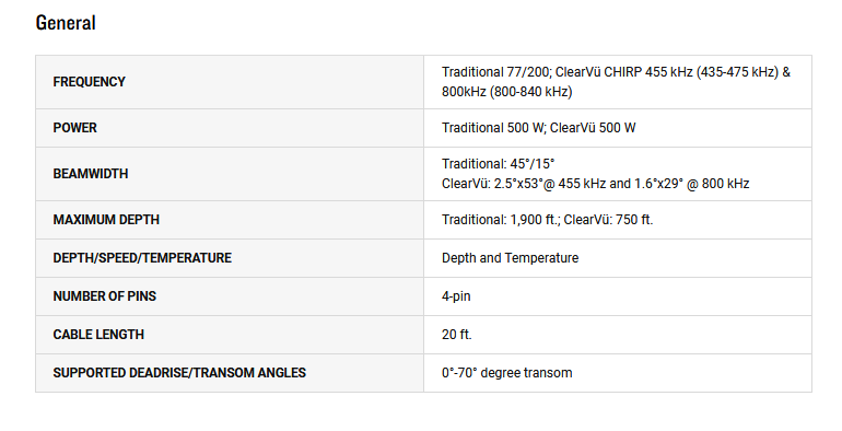 - Operating Frequencies: Functions at 77/200 kHz for traditional readings and 455 kHz for DownVü imaging.