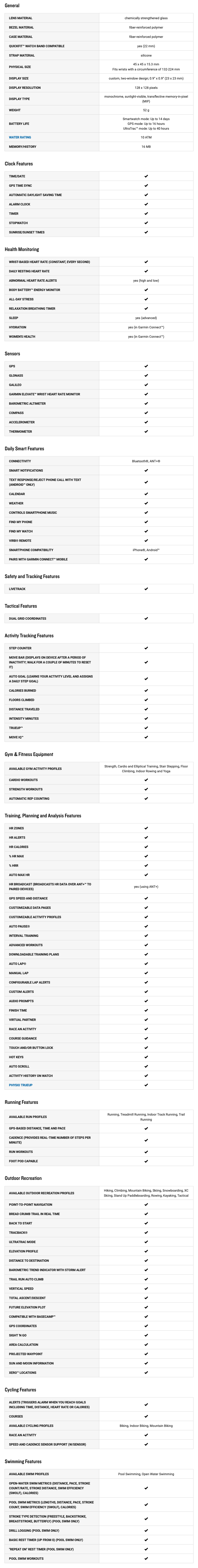 - Long Battery Life: Up to 14 days in smartwatch mode, 16 hours in GPS mode, and 40 hours in UltraTrac mode.